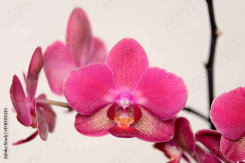 © DyMaxFoto, Obraz premium Beautiful orchid flowers blossom on beige background closeup