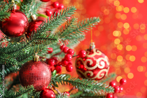 © New Africa, Naklejka premium Beautiful ornaments on Christmas tree against red background with blurred lights, closeup. Bokeh effect