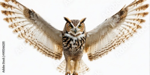 © piyawat, Obraz premium Beautiful owl in flight with wings spread, sharp gaze, and vibrant feathers against a white background.