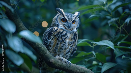 © MakoPoko, Obraz premium Beautiful owl perched on a tree branch surrounded by lush green foliage in a serene night forest, illuminated by soft moonlight.