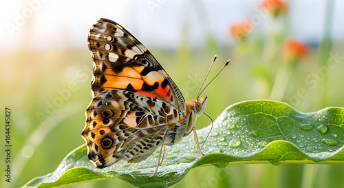 © raditex, Obraz premium Beautiful Painted Lady Butterfly Perched on Green Leaf with Dew Drops in Sunlight