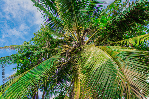 © Lyudmil, Fototapeta premium Beautiful palm tree under blue Caribbean sky. Holiday mood.