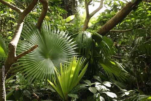 © New Africa, Obraz premium Beautiful palm trees with green leaves and other plants growing outdoors