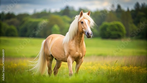 Fototapeta premium Beautiful palomino pony standing in a green field, palomino, pony, horse, equine, livestock, farm, animal, brown, mane