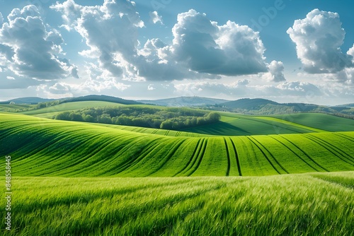 © Spectrum, Fototapeta premium Beautiful Panorama of Rolling Green Fields. Spring or Summertime Background with White Fluffy Clouds and Natural Landscape