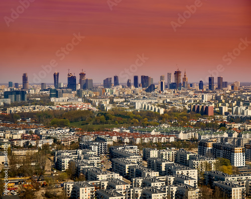© udmurd, Fototapeta premium Beautiful panoramic aerial cityscape - view from the window of the plane landing at the center of Warsaw (Poland) with skyscrapers, with parks and residential areas, spring at sunset