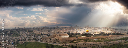 © edb3_16, Fototapeta premium Beautiful panoramic aerial view of the Old City, Tomb of the Prophets and Dome of the Rock. Dramatic Sky with Sunrays Composite. Jerusalem, Capital of Israel.