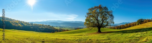 Obraz premium Beautiful Panoramic Landscape with a Lone Tree in a Green Field under a Bright Blue Sky and Sun