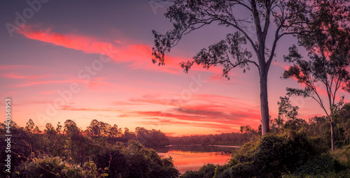© Kevin, Fototapeta premium Beautiful Panoramic Riverside Sunset with Cloud Reflections