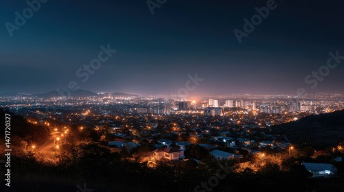 © Suphawan, Obraz premium Beautiful panoramic shot of a city illuminated by thousands of street lights at night, with the glow of buildings creating a captivating skyline