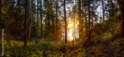 © edb3_16, Obraz premium Beautiful Panoramic View of a forest near the ocean during a golden and vibrant sunset. Taken in Lighthouse Park in West Vancouver, British Columbia, Canada.