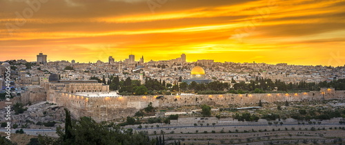 © John Theodor, Fototapeta premium Beautiful panoramic view of Jerusalem - Old and New City, with the Dome of the Rock and the Temple Mount, south-east wall corner with Hulda Gates archaeological site and dramatic orange sunset sky