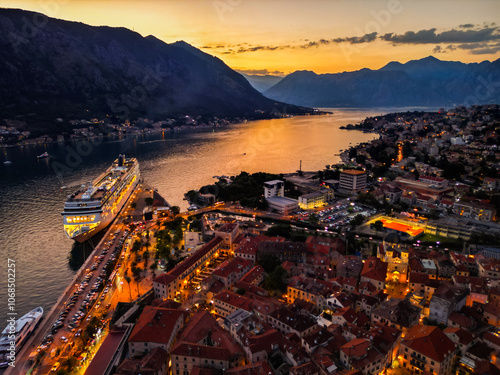 © VasylisaDvoichenkova, Obraz premium Beautiful panoramic view of Kotor, Montenegro at night. Sea and mountains
