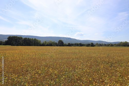 © Johan, Fototapeta premium Beautiful panoramic view over extensive French bean fields with hills in the background. Photo was taken on a sunny day with a blue sky.