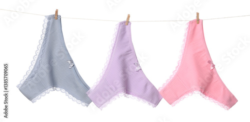 © New Africa, Fototapeta premium Beautiful panties on clothes line against white background