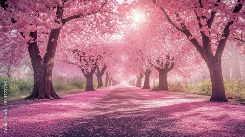 Naklejka premium Beautiful Park Filled with Cherry Blossom Trees in Full Bloom Creating a Pink Canopy