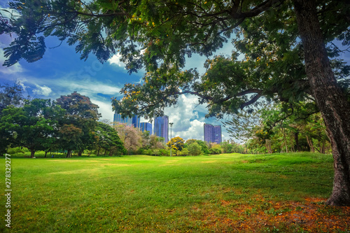 © songphon, Obraz premium Beautiful park scene in public park with green grass field,