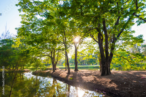 Naklejka premium Beautiful park tree with green lawn and pond