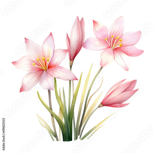 Naklejka premium Beautiful Pastel Pink Rain Lily Or Zephyranthes Flower Botanical Watercolor Painting Illustration