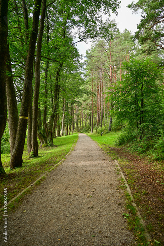 Naklejka premium Beautiful path through a forest on the hiking trail in summer through Aukstaitija National Park near Paluse, Ignalina district, Lithuania