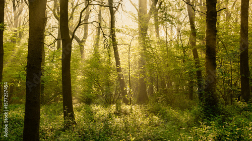 © veneratio, Naklejka premium Beautiful peaceful Spring sunrise landscape in bluebell forest with sun beams and hazy distance