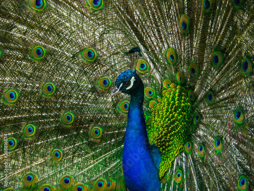 Fototapeta premium Beautiful peacock dissolved the tail closeup.