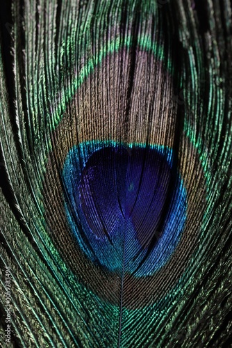 © New Africa, Obraz premium Beautiful peacock feather as background, macro view