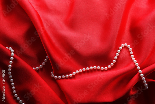© New Africa, Fototapeta premium Beautiful pearl necklace on red cloth, top view
