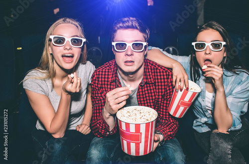Naklejka premium Beautiful people in glasses are looking straight forward. They has opened their mouthes. Each of them has a piece of popcorn in their hands. They look excited.