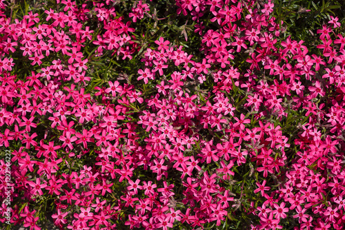Fototapeta premium Beautiful Phlox subulata with bright pink flowers. Gardening, top view