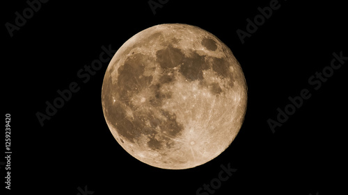 © Del Henderson Jr , Obraz premium Beautiful photo of full super moon, Hunters moon isolated against a black night sky background with copy space.
