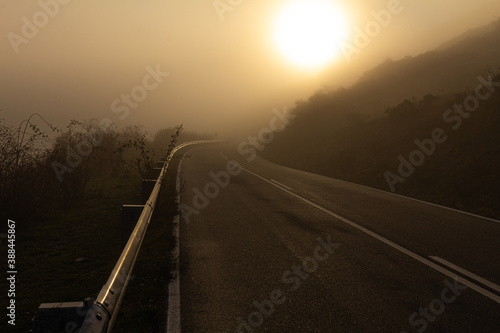 © Rodrigo_Fernandez_Ph, Fototapeta premium Beautiful picture of a road in a foggy day during the sun rising. Close up looking of the tarmac. Low shot.