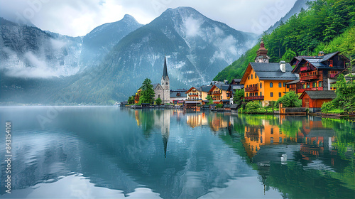 Fototapeta premium Beautiful picturesque village inspired by Austrian Alps, lake and mountains...