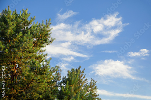 Obraz premium Beautiful pine trees and blue sky background