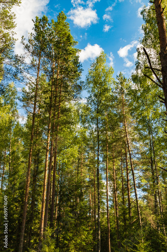 Fototapeta premium Beautiful pine trees in wild forest and blue sky