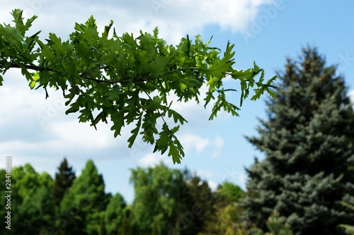 © Goshashka, Obraz premium Beautiful pine trees on background high mountains.
