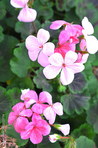 Naklejka premium beautiful pink and white flowers from geraniums in the yard