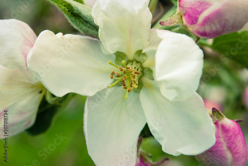© writerfantast, Obraz premium Beautiful pink apple flowers, spring background.