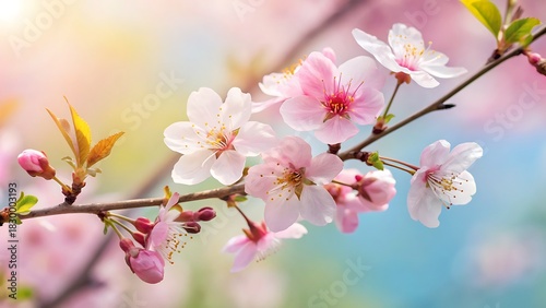 Obraz premium Beautiful pink cherry blossom branch blooming in bright spring sunlight