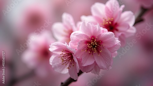 © GMeta, Fototapeta premium Beautiful pink cherry blossom petals with pollen against soft bokeh background