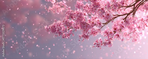© AndiAzis, Fototapeta premium Beautiful pink cherry blossom tree with falling petals and soft