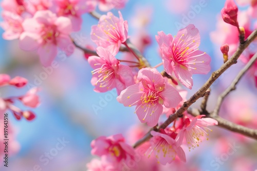 Obraz premium Beautiful pink cherry blossoms in full bloom on tree branches under a clear...