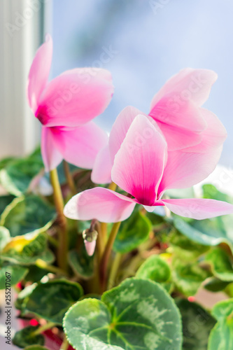Fototapeta premium beautiful pink cyclamen in pot on window sill. domestic flower, selective focus
