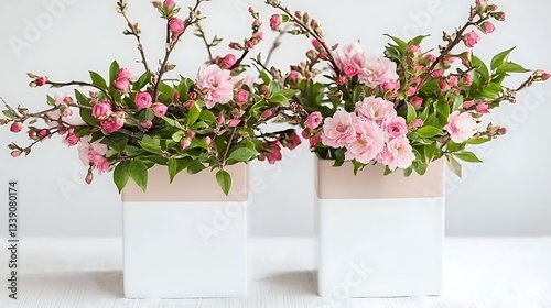 © Sumet, Fototapeta premium Beautiful pink flower arrangements in stylish modern white and pastel boxes on a light background