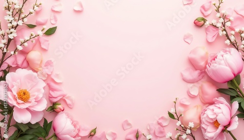 © KAMAPAN, Fototapeta premium Beautiful pink flower frame on pastel background.