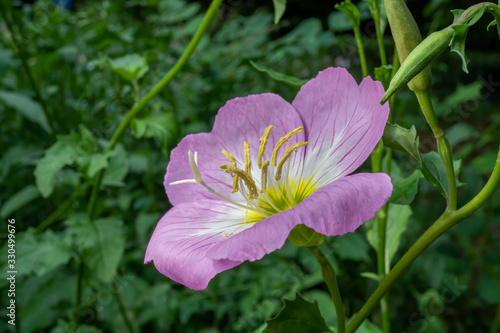 Naklejka premium Beautiful pink flower with a green background - evening primrose