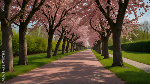 © Neelam, Fototapeta premium beautiful pink flowering cherry tree avenue in Holzweg, Magdeburg, Saxony-Anhalt, Germany, footpath under sunny arch of cherry blossoms.generative.ai