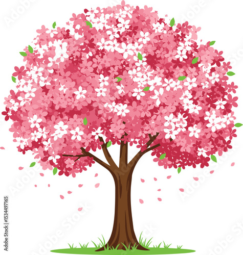 © Hasan Creatives, Fototapeta premium Beautiful pink flowering tree with vibrant blossoms and green leaves, isolated on a white background, perfect for nature-themed designs, spring, and seasonal illustrations on Adobe Stock.