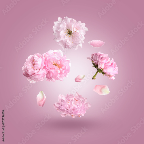Fototapeta premium Beautiful pink flowers and petals in air against violet gradient background