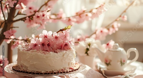 Fototapeta premium beautiful pink flowers are shown behind the cake and teapot